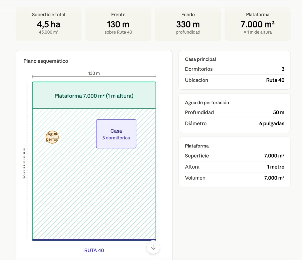 Uno de los aspectos más destacados de esta finca es su ubicación estratégica sobre la Ruta 40, lo que facilita el acceso a servicios y comercios locales. Además, la finca cuenta con 150 metros de frente aproximados y 350 metros de largo aproximadamente, lo que proporciona una gran flexibilidad para desarrollar diferentes proyectos.